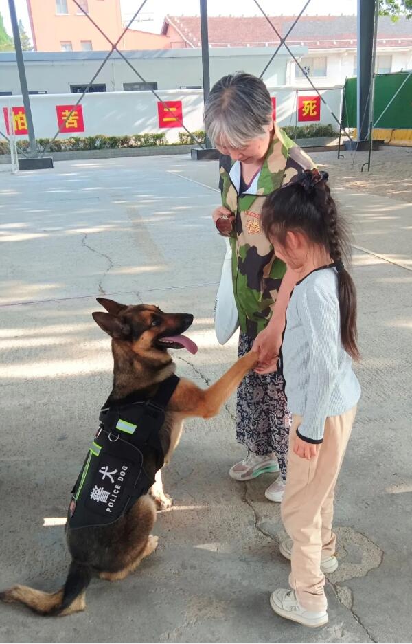 此次“军营开放日”活动,还有一位特别的表演嘉宾——军犬“悟空”。在驯犬员的指令下,“悟空”依次坐、卧、跳跃,迅捷灵敏。孩子们纷纷上前,迫不及待与军犬互动。“你真棒!”孩子们摸摸“悟空”的头,夸赞道。