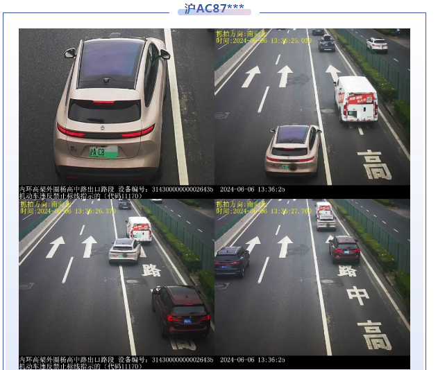 ▲2024年6月6日13时36分,号牌为沪AC87***的小型轿车在内环高架外圈杨高中路出口路段,实施了“机动车违反禁止标线指示的”违法行为。