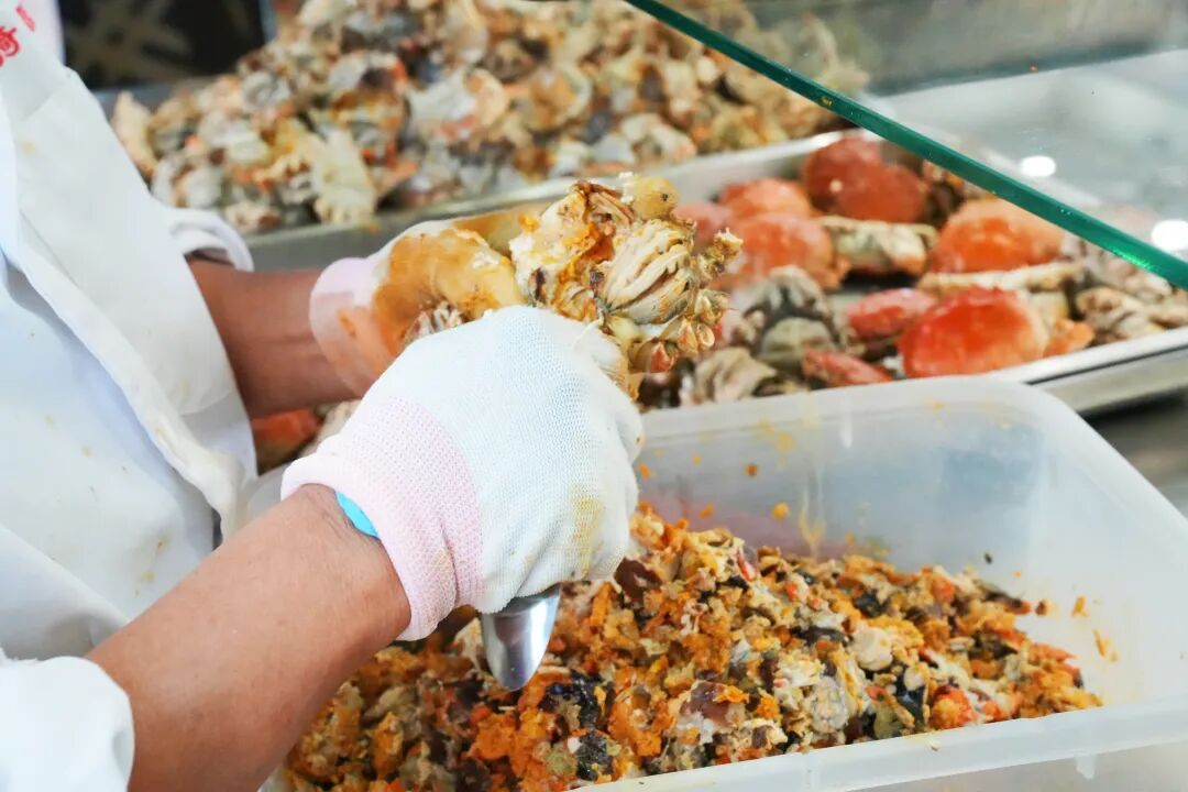 提到南翔小笼,古猗园餐厅是绕不开的经典。后厨的师傅们每天坚持现包现蒸,在高峰期,每人一天能做出3000只小笼,却始终不失手工的细腻与温度。眼下正值蟹粉小笼的时令旺季。这里的蟹粉,全由师傅现场拆蟹制作,金黄油亮的蟹油裹着饱满蟹肉,被妥妥地“藏”进每一只小笼中。轻轻咬开,蟹香与肉香瞬间迸发,馅料油润却不腻口;柔韧的外皮吸满鲜醇汤汁,每一口,都是限定于秋日的舌尖盛宴。