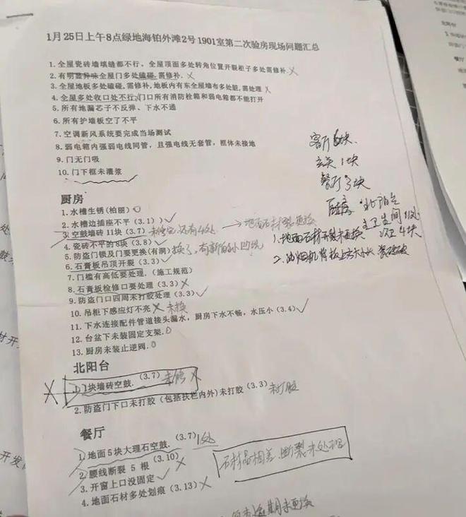 除此之外,电动窗帘电机线路裸露;入户门下沿贴边有所倾斜……虞女士拿着一张手写的清单,上面记着20多条未修复的问题。