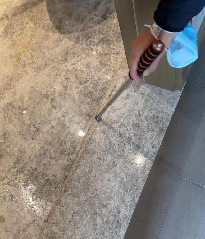 当天验房师刚进门,就发现进户门南侧的装饰钢板有划痕,门外的墙砖还裂了道缝。