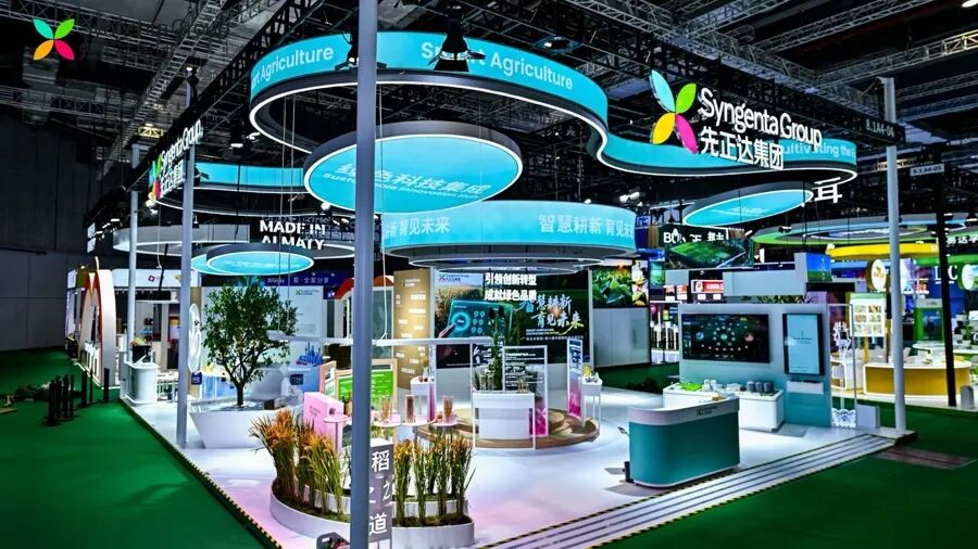 走进先正达集团展台,中央是一座别具特色的“创新岛”,这里汇聚了四款全球独创、效用显著且影响广泛的突破性技术。三层环形展台中央,一株株水稻、小麦、大豆和玉米在灯光下生机盎然。