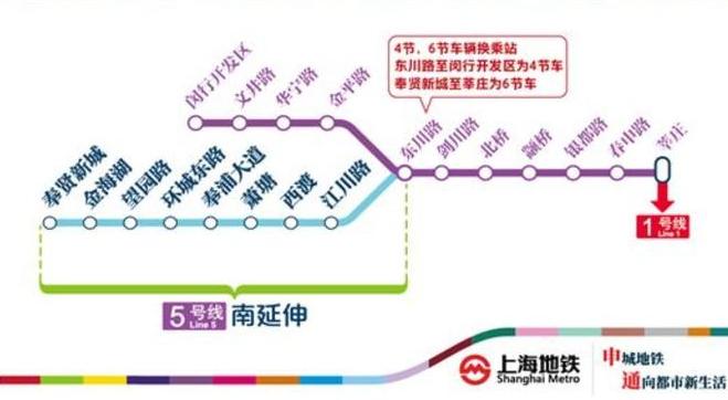 上海地铁5号线南延伸段是奉贤区首条轨道交通线路,于2018年12月底通车试运营。南延伸工程北起既有线东川路站,南至奉贤新城站,线路全长约19.5公里,全线共设东川路站、江川路站、西渡站、萧塘站、奉浦大道站、环城东路站、望园路站、金海湖站以及奉贤新城站9座车站。其中,东川路站—奉浦大道站为高架站,环城东路站-奉贤新城站为地下站。