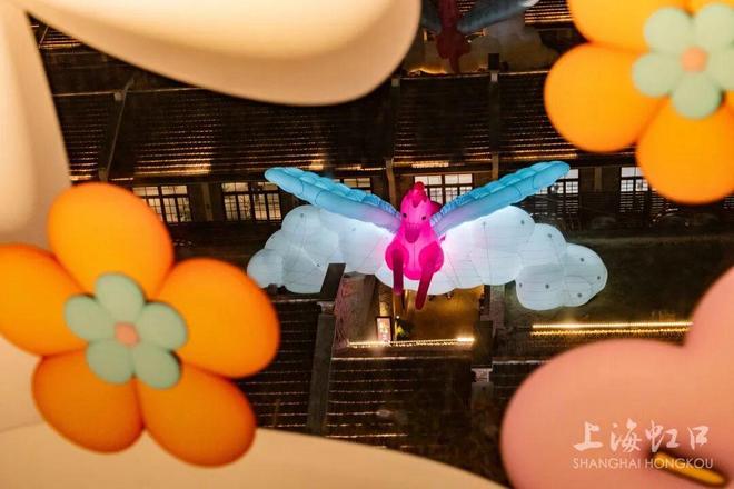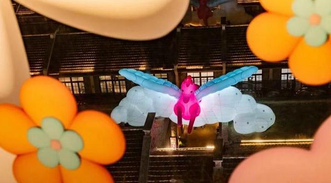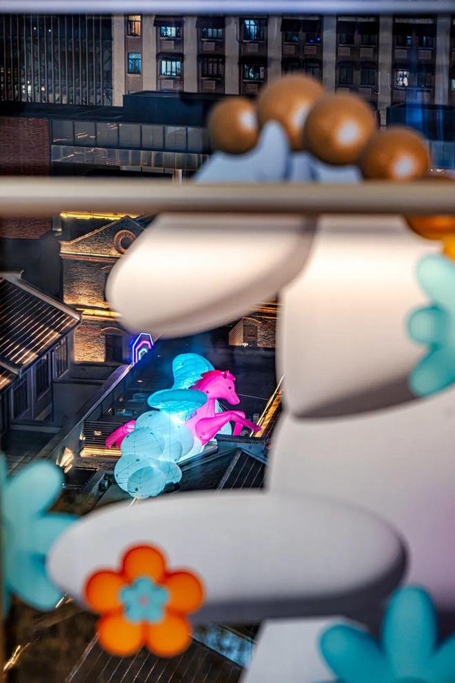 弄堂屋顶的“骏跃瑶台”装置颇具奇幻感,粉蓝色飞马造型搭配蓬松白云元素,宛若仙灵降临。行人穿梭弄堂时,可感受天马“掠过”的梦幻意境。从甜爱廊俯瞰,更能完整观赏天马随云影游弋弄堂的全景,百年弄堂由此变身沉浸式新春童话场,传递“以梦为马、心愿成真”的祝福。