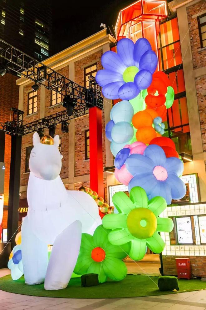 南广场的“亮马生花”装置以“繁花伴马贺新春”为灵感,采用绑扎气球艺术形式,以巨型充气花朵环绕白马造型,通过艳丽色彩与灵动形态,传递生机与希望。白马或休憩或踱步的造型憨态可掬,将春日花海的绚烂与马年寓意浓缩于一处。