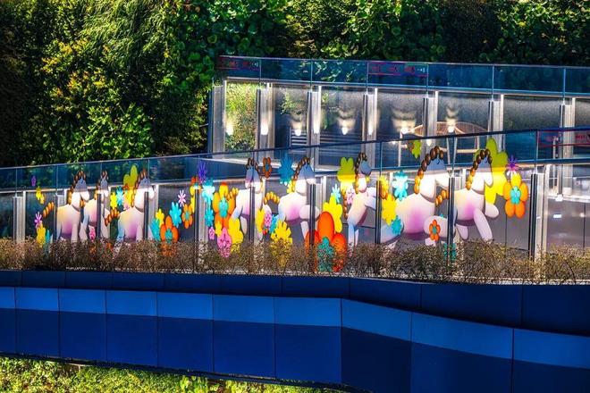 甜爱廊沿廊玻璃则呈现“驰梦甜爱”景象,延续“亮马生花”的艺术风格,满贴白马踏花、春风得意的图案,将马匹与繁花交织定格。游人漫步廊间,可直观感受“马伴花行、爱随春至”的甜蜜氛围,与南广场装置形成呼应。