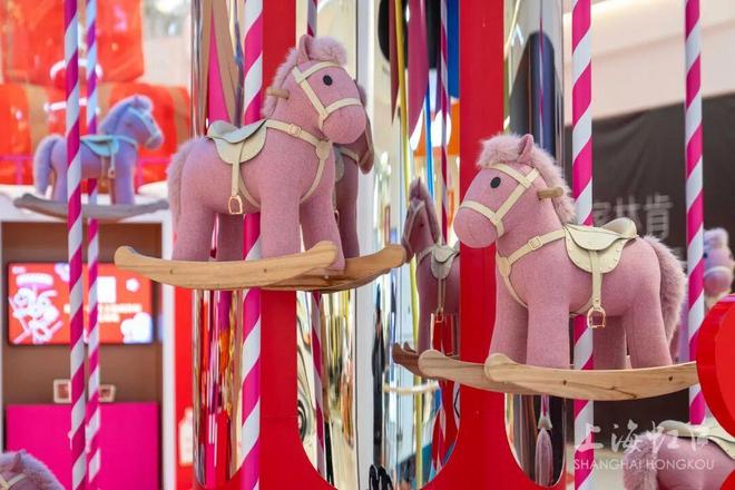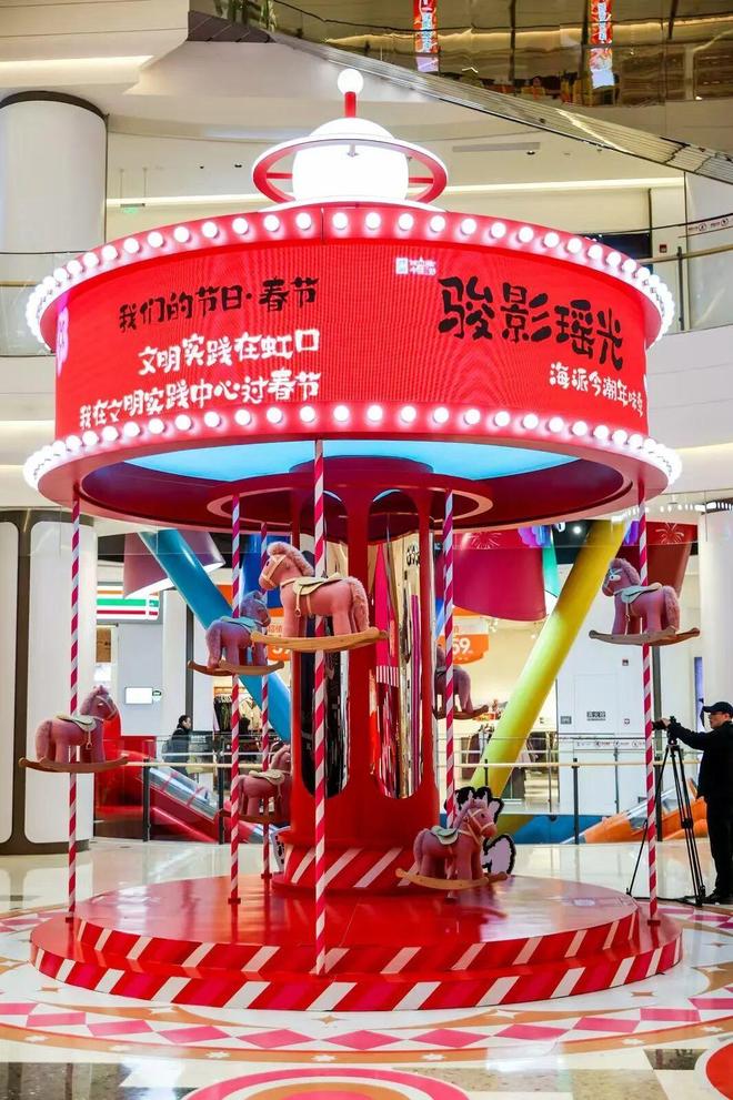 中庭的“驭马游春”装置以旋转木马为设计核心,采用正红主色调契合新春氛围。8匹小马在主体结构中上下灵动跳动,周边12只摇马同步营造欢腾氛围,配合屏幕及地台条纹装饰,增强装置“旋转”动感。该装置设置互动环节,游人可通过摇马与地贴参与体验,寄托马年顺遂纳福的美好心愿。