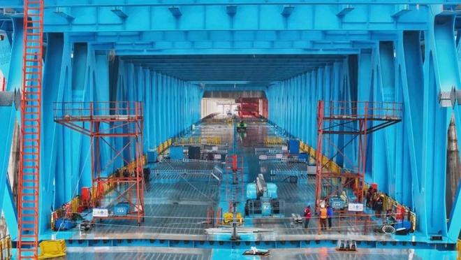 崇启公铁长江大桥主通航孔桥为双塔双索面钢桁结合梁斜拉桥,主跨400米,钢桁梁总长992米,总重量约3.6万吨,采取边跨拖拉、中跨单悬臂架设的施工方案,主通航孔桥共需架设13个节段钢梁,其中自4号墩向3号墩单悬臂架设6个节段。单个钢梁节间长为12.5米,最重节段为918.4吨。架设工期为5个月,预计到今年5月实现合龙。首节单悬臂钢梁架设完成之后,将进行斜拉索挂设施工。