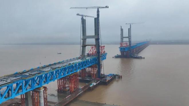 沪渝蓉高铁崇启公铁长江大桥:4号墩向3号墩单悬臂架设施工
