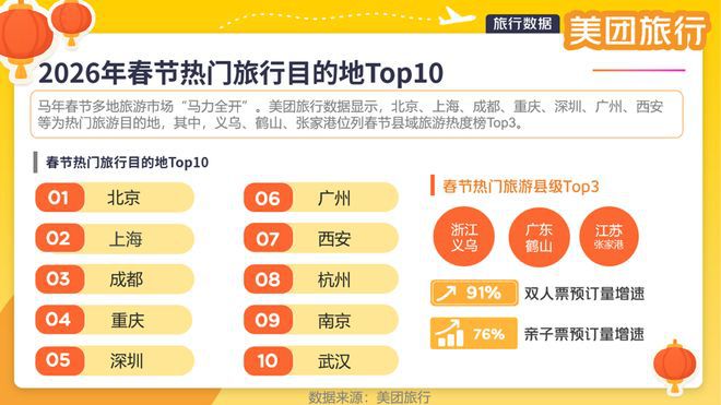 2月23日,美团发布的《2026春节消费洞察报告》显示,受返乡团圆、反向过年等多种出行需求场景激发,北京、上海、成都、重庆、深圳、广州、西安、杭州、南京、武汉为热门旅游目的地Top10。