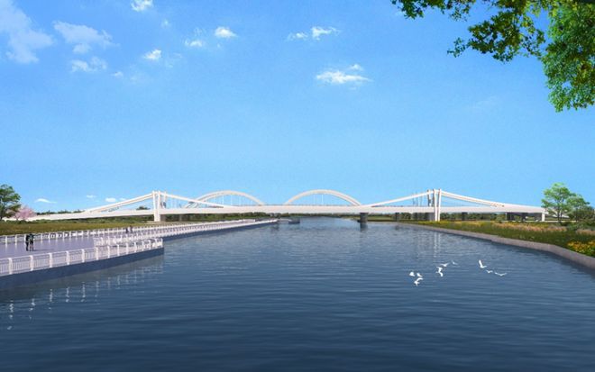 根据方案,中春路跨淀浦河桥梁改建工程,南起疏影路、北至黎安路,长度约756米,建设规模为双向4车道。主要建设内容是现状中春路高架东西两侧新建跨越淀浦河的机动车通行辅道桥,同步实施桥梁接地面道路改造工程,以及相应的排水、人行梯道、无障碍电梯、绿化景观等工程。辅道桥主桥为刚性悬索结构、引桥为钢混叠合梁结构,桥梁长约368米,梁底标高不低于8.68米。