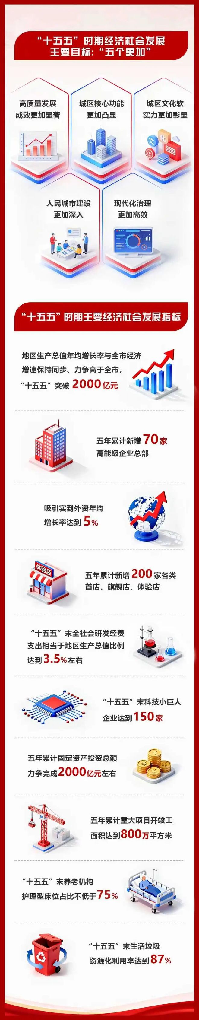 展望2035年,在“十五五”发展基础上,再奋斗五年,虹口将实现综合实力大幅跃升,核心功能全面增强,现代化治理走出新路,人民生活更加美好,承载上海“五个中心”建设的功能全面升级,北外滩新时代都市发展新标杆地位更加巩固,基本建成具有强劲实力、独特魅力和重要国际影响力的一流中心城区,成为中国式现代化重要展示窗口。