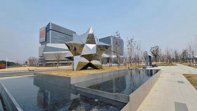 在靠近上海工业智能中心的一侧,还有一座名为《开普勒之星》的光影雕塑,它采用星状正十二面体作为作品的结构造型,镜面材质。夜晚,光源从雕塑内部向外照射,呈现出璀璨的几何光晕,仿佛一颗降落于绿地之上的人造星辰,与“ai立方”智研盒子遥相呼应,共同演绎着科技与艺术交织的星空对话。